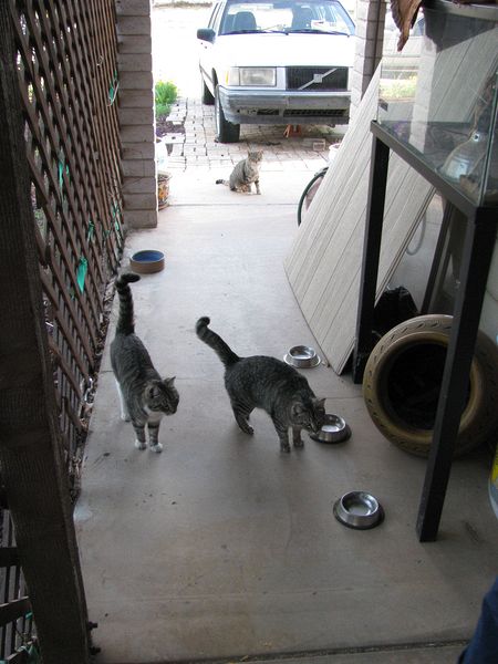 Some of our inherited "Yard Cats", Angie (L), Mini Mew (R) and Mittens (rear). Mini Mew is the momma.