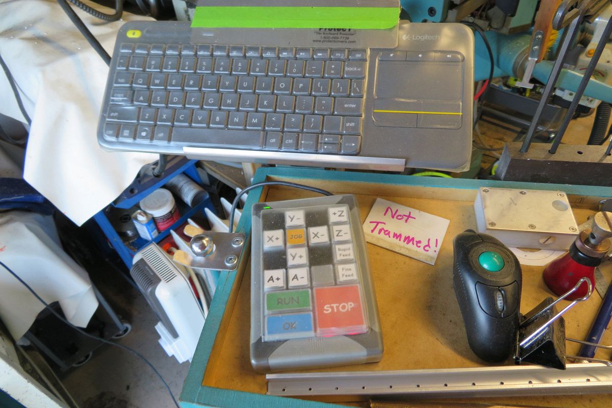 The top of the tooling cart which has a Logitech wireless keyboard and the X Keys controller. The keyboard can be removed from the holder by pulling it away from the magnets at the top. The handheld trackball mouse was used prior to my purchasing a used OLE touch screen display.