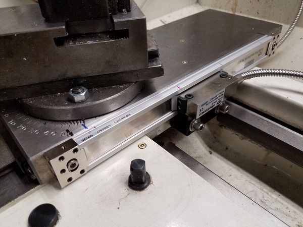 The installed cross slide scale prior to adding the scale cover and lashing down the cable. The other miracle was the two holes to mount the reader head bracket that i had previously drilled were spaced and located perfectly. Just bolt and go...