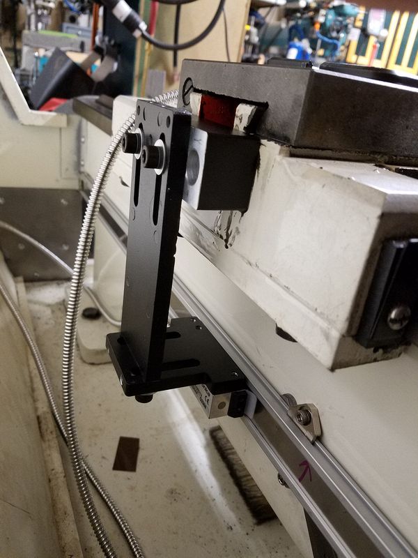 Initial mounting of the Z Axis read head. I did not take into account the scale cover and had to move the sensor to the top side of the bracket which necessitated a spacer being added to the mix. If I get really ambitious I may make a replacement vertical bracket to replace the too short one and the spacer block. Then again, how many people are going to be looking back there??