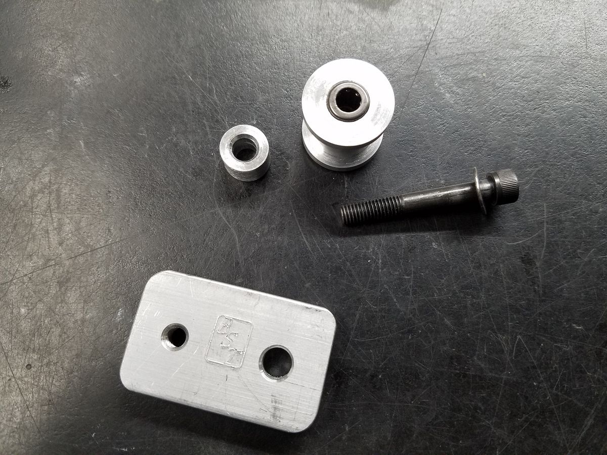 Components for the tensioner. The pulley is a piece of 0.750 aluminum round bored to fit some 3/16 needle roller bearings. There are two pressed into the pulley. The ride on the smooth part of the Allen bolt. Spacer positions the pulley on teh belt centerline.