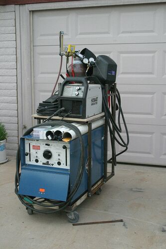 The welder came on the dolly seen in the top picture. I added the bottle rack and shelf to hold my Hobart Handler MIG welder. I now have all the welding stuff confined to one moveable unit. I had to do a little rewiring on the house to support the new welder, but hey, I needed to replace that service panel on the house.....