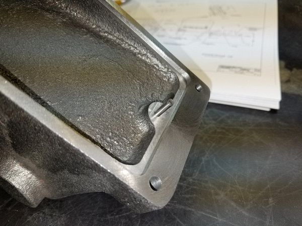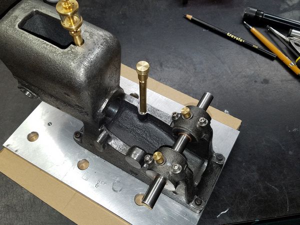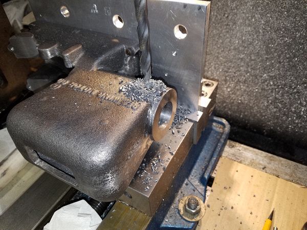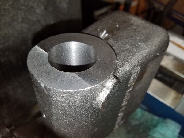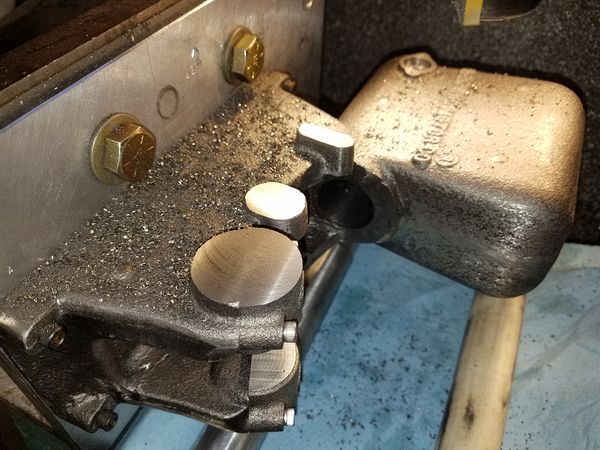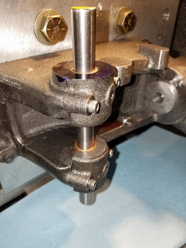 The casting and jig was flipped and the centerline of the cylinder bore was checked to verify the alignment with the mill table. The pads were faced off, but not to spec at this time. The bushing journals were drilled to just under 0.625 and then reamed to .001 oversize for a tight fit when bolted together. After bolting it up, the bores of the bushings were reamed to 0.500" and piece of drill rod was used to check the fit. Nice smooth fit!