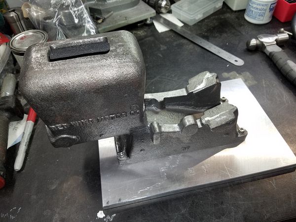 Setup to tap the 10mm x 1.0 sparkplug hole. Not being familiar with cast iron I elected to hand tap and used an angle plate to hold the fixture .