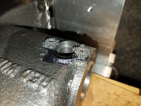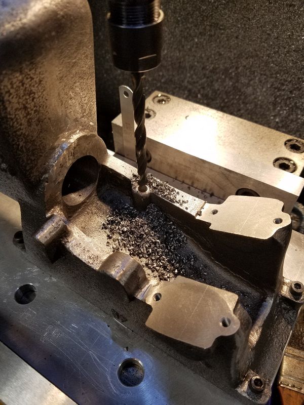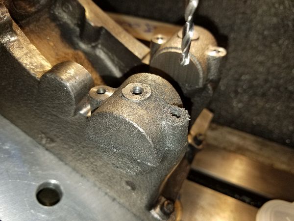 Drilling and tapping the main cap stud holes. I used flexible super glue to mount the caps to hold them in position while doing this. Funny thing was, it took a pretty good whack with a bronze hammer to break then free!