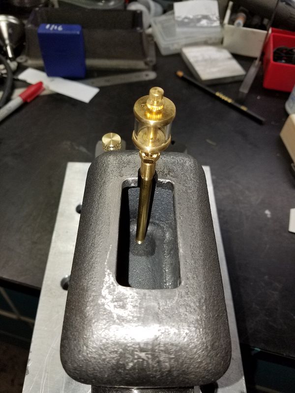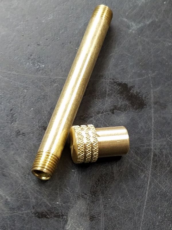 A piece of heavy wall brass tubing from the scrap drawer provided a 1/16 pipe nipple after some threading using the collet chuck and Neil Butterfields really cool tailstock tapping tool. A cap was turned from a piece of bronze rod and knurled for looks.
