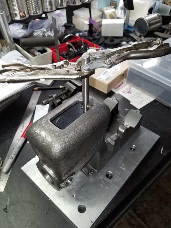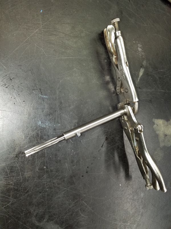Due to the deep pocket of the water jacket I had to make a tap extension to reach where I need to thread. Piece of 3/8" stainless rod and a 4-40 Allen set screw did the job. T handle by Irwin did the trick.