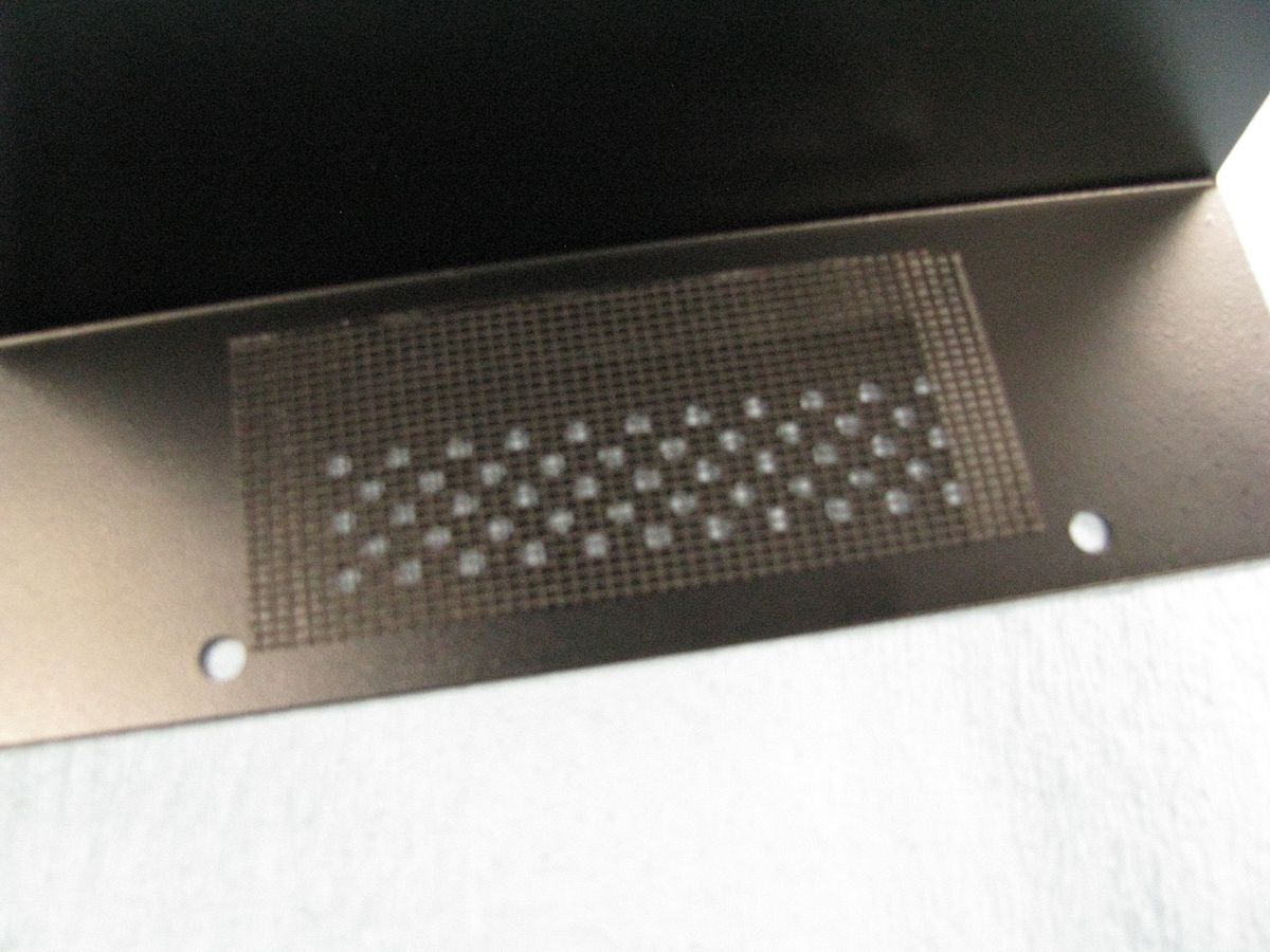 A small piece of screen mesh was added to the vent holes in the cover to keep the swarf out of the circuitry.