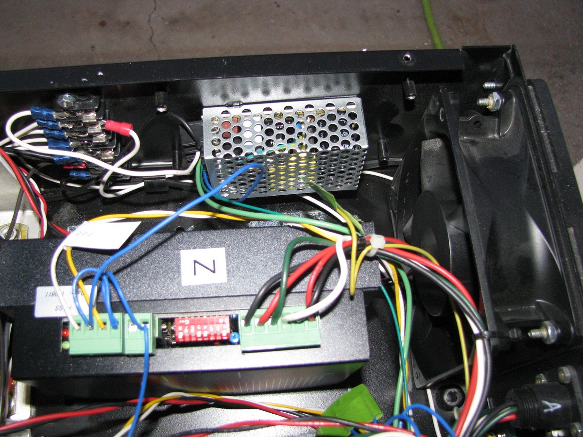 Detail shot of replacement 5VDC supply. One wire from the original supply was pinched under on of the original stepper driver modules and decided to short out during the final testing process. Cabinet main cooling fan is on the right. The new stepper drivers have a fin type heat sink and cooling fan.
