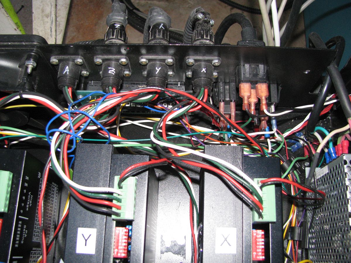 Inside view of the rear panel of the drive rack enclosure. Motor output connectors are now organized in a logical manner. Previous they were in (an apparent) random order.
