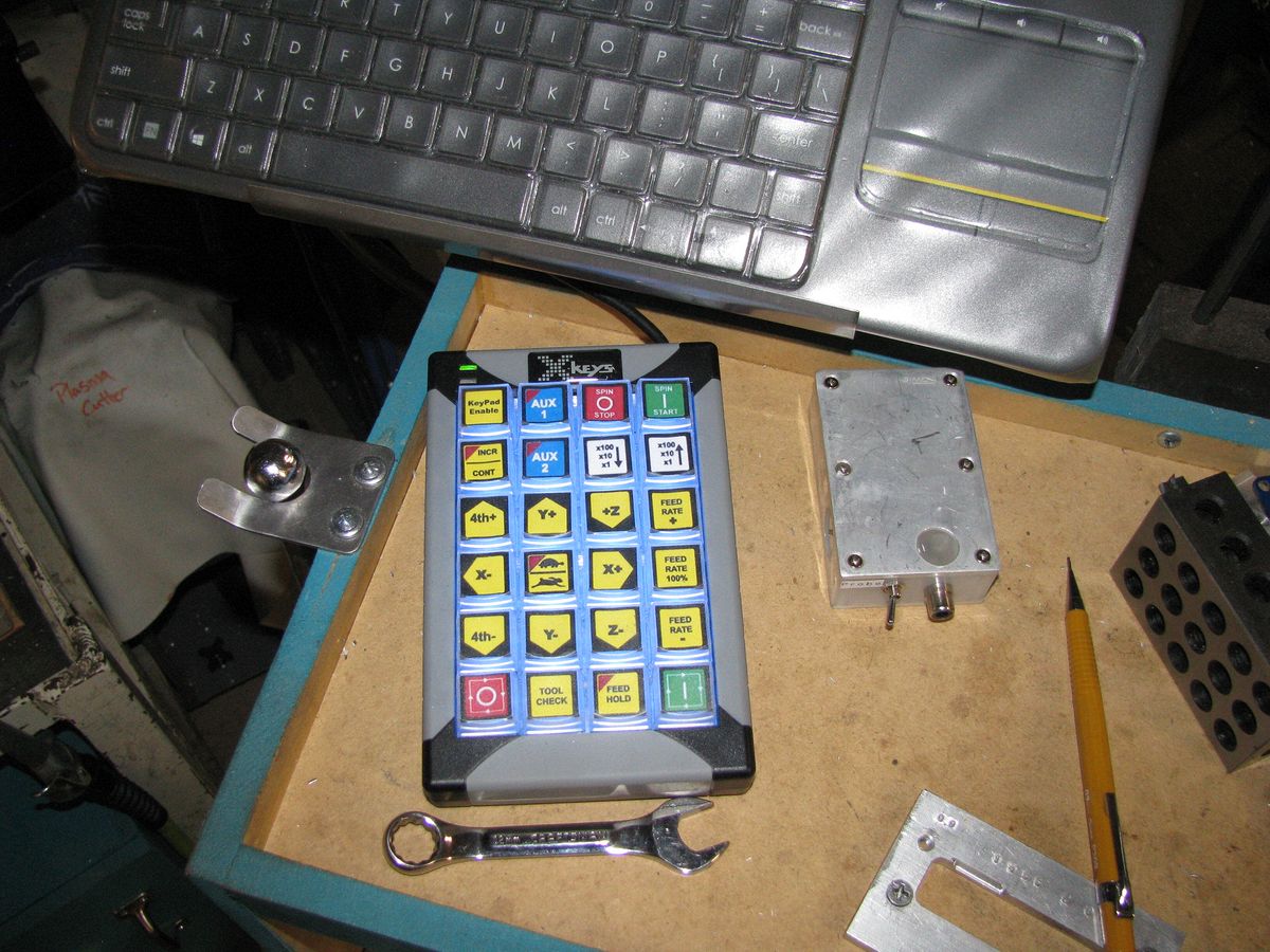 The Pi Engineering X Keys XK24 programmable keypad. To its right is the electronic zero setting device that has been modified to accept a cord to allow it to be connected to the Acorn controller. The wireless keyboard above is removable for use if desired.