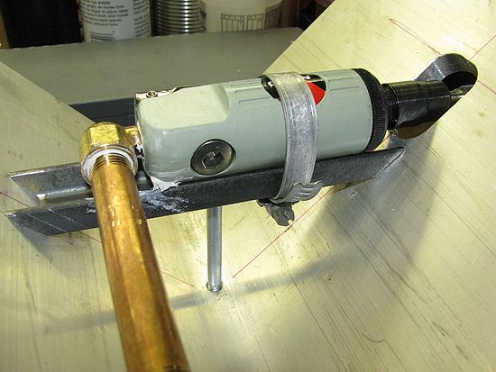 Die grinder mounting, I will add a second heavy duty clamp when finalizing the assembly. The throttle lever is trapped under the clamp and a ball valve will be the on/off and speed regulation will be via the hex fitting in this picture.