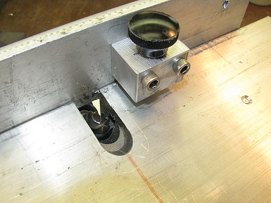 The micro adjustment for the work surface is off set from the center line (orange marker) a little bit to clear the cutter opening.