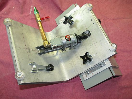 Full bottom view. Note the rubber feet, even though the unit is fairly heavy, the feet were needed to prevent it from creeping along the bench. The star knobs are the clamps for the work surface adjustment. A second HD clamp has been added, this is a very secure mounting. Not shown in any of the pictures is the bolt that is under the die grinder that holds the grinder mount into the main body. The ends of the mount are cut at 45° and were left sharp from the milling operation to make it grip the housing better.