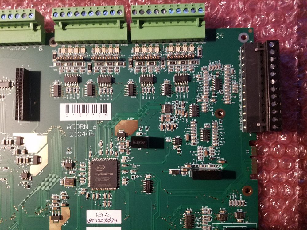 Upper Right, two Input blocks for 16 inputs along with two analog inputs (black connection) The inputs have the ability to handle 24/12/5 volts and the SIP sockets are where you make the changes. No SIP and it's 24V