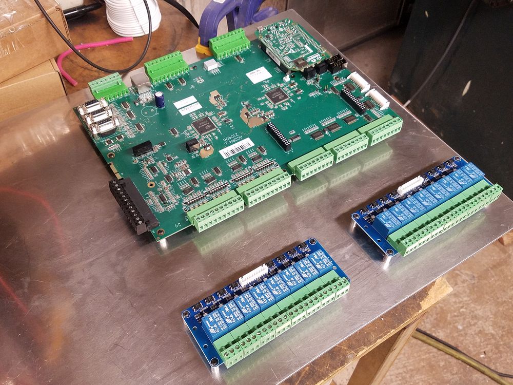 Installation of the AcornSix and the two output relay modules. I elected to have the edge of the board with the power and 5V drive connections at the back as that was going to be the edge that I was least likely to have to access during set up and troubleshooting.