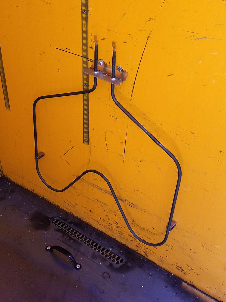 Oven element attached to the sidewall. The oven elements are 2000 watt units purchased from McComb's in Pennsylvania. About $8 each.