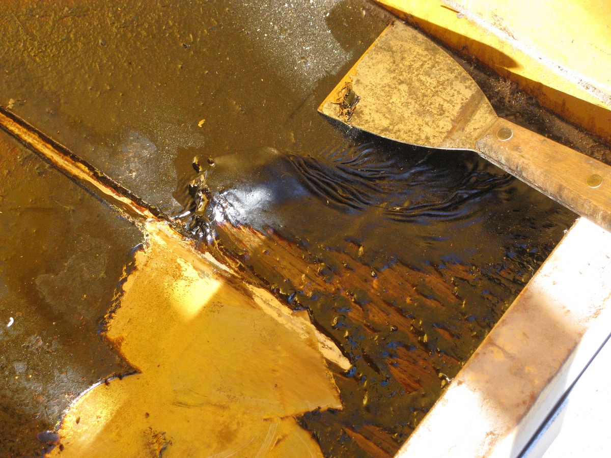 Underneath the removable floor a gooey mess was found. Turns out letting it sit in the sun the goo started to flow. Stiff scraper made short work of the mess....
