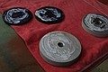 I went to Metal Supermarkets in Tempe, AZ and had them cut four 3/4" thick slices from a piece of 5" hot rolled steel. I then put the pieces in the lathe and beveled the edges. Then they were mounted in the mill and a 3/4" NC hole was drilled and tapped in the center.