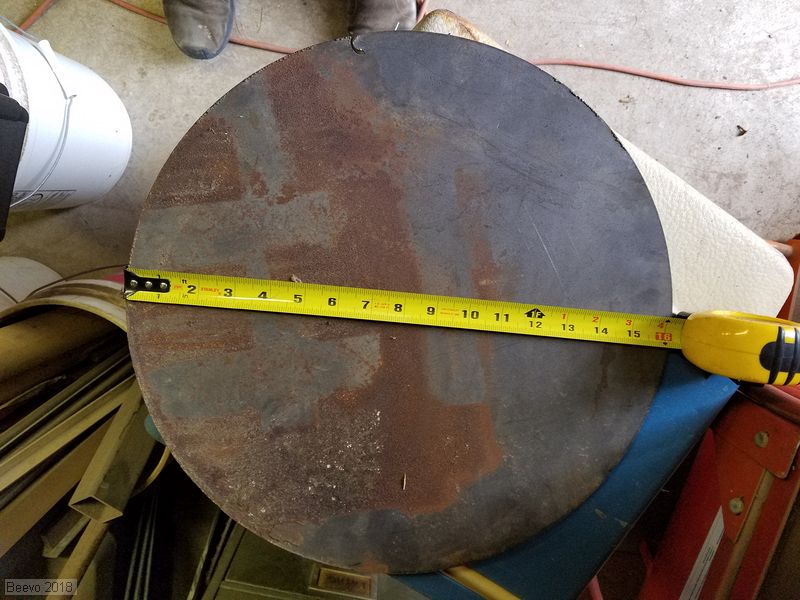 Being a compulsive pack rat when it comes to metal, I just happened to have a 16" diameter disc of 1/4" steel plate. I got a bunch of drops from a manufacturing company, you can see the little curly cut at the top.