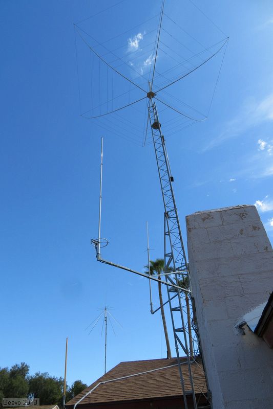 Wide shot of the antenna array looking to the south. The folding support leg can be seen hanging on the right side of the tower in this view.