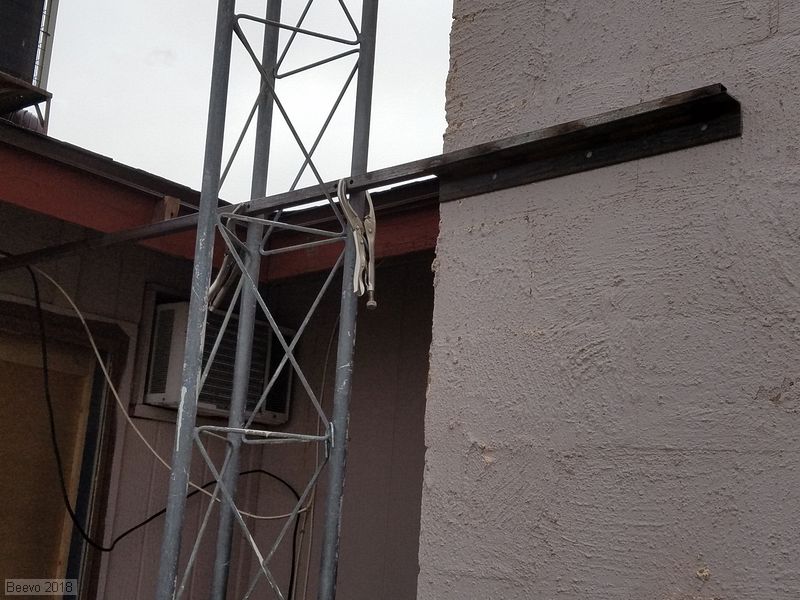 Test fit of the initial brace, lower. 3/4" square tube welded to a 24" section of 2X2X3/16 angle iron. Big vice grips held it in place while drilling for the anchors in the fireplace.