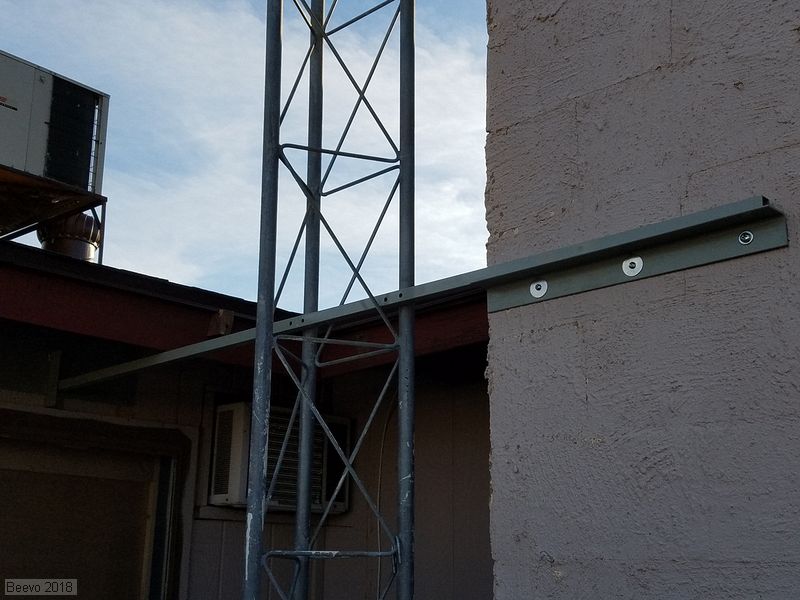 Bottom brace installed and ready to fasten to the tower with galvanized U-bolts. This brace is about 8' above the ground. A cross brace to the West will be added next.