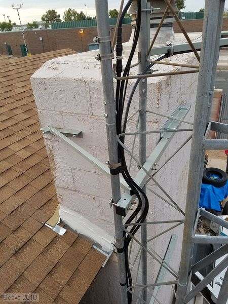 Close view of the upper brace. Attachment to the east face of the fireplace is pretty much a duplicate of the lower brace. This brace is at the 13' level. A diagonal brace helps stabilize the brace.