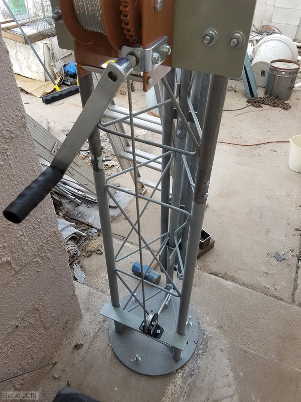 Winch and pulley layout. Note pulley is mounted to one side to align with the attachment to the lower tail tube.