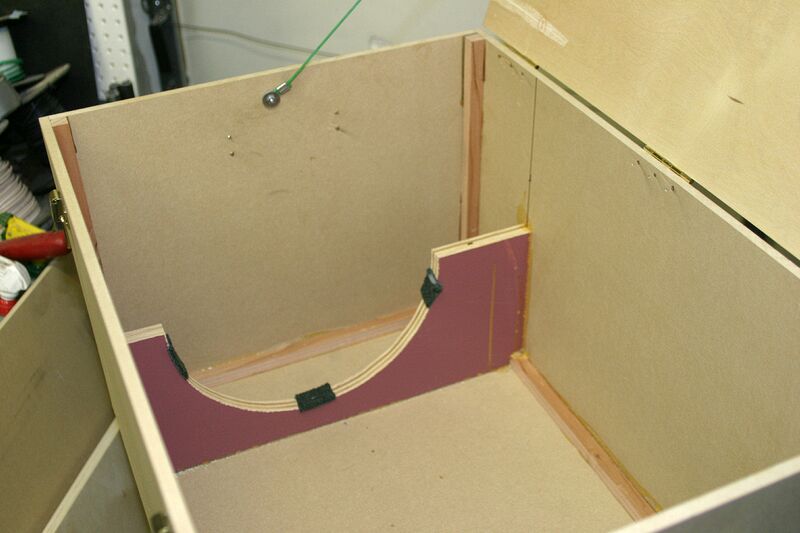 The box was constructed of 1/2" MDF with 3/4" square stiffeners in the corners and a 1/2" Baltic Birch plywood top. If I had it to do over again I would have used 1/2 Baltic Birch for the entire case instead of the MDF/plywood combo. I had a sheet of MDF around so I used that. 1/2" lumber was used to keep the weight down. The empty case weighs 27.9 lbs.