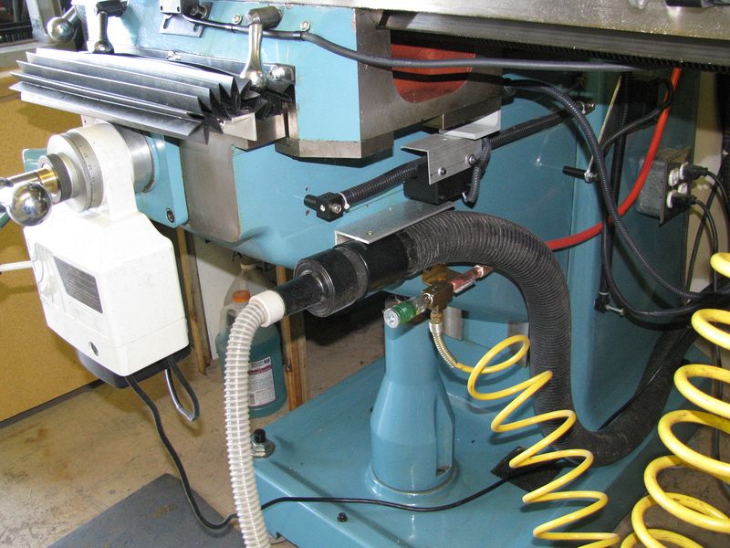 Here is the updated air hose, air fitting and shop vacuum outlets on the front of the knee. Right above you can see the Y axis encoder for the newly installed Shooting Star DRO. Details of the installation are on this page.